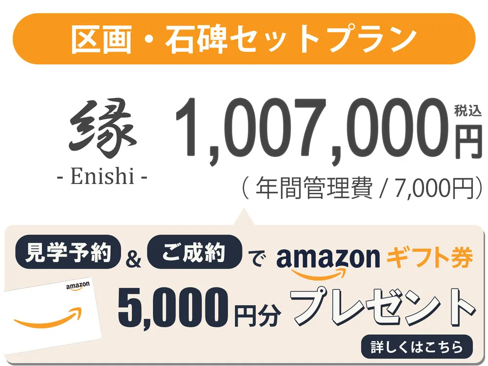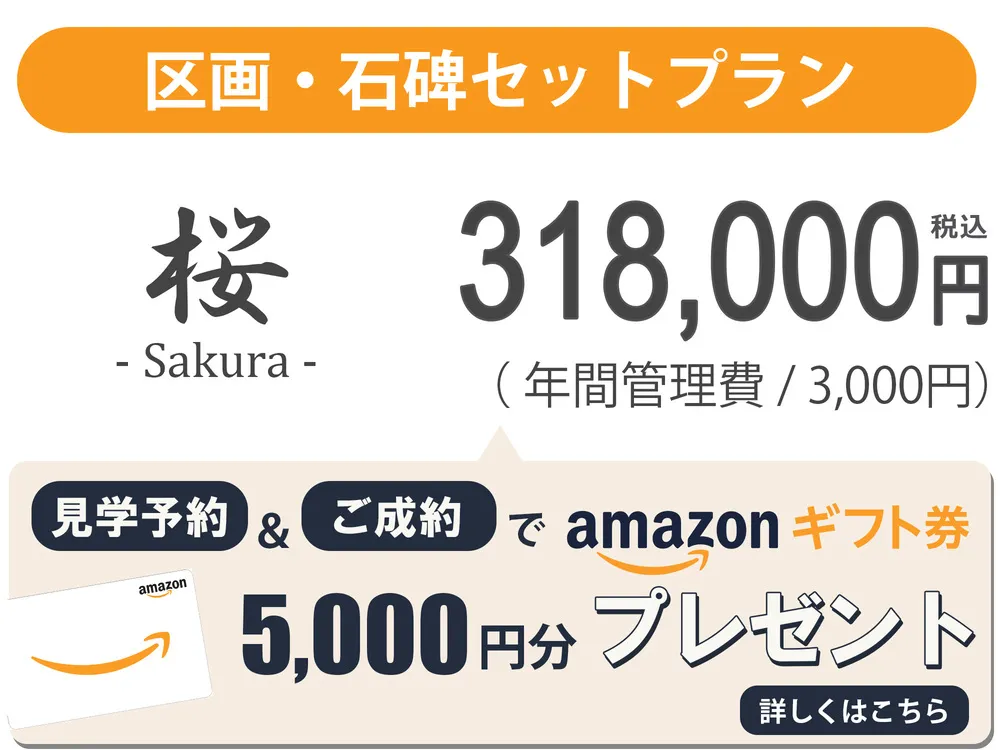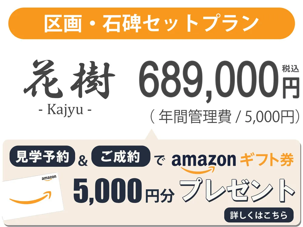 樹木葬「ひかりのガーデン」を公式サイトから見学予約してお申し込みをすると、紹介サイトよりもお安くなり、更に特典としてAmazonギフト券5000円プレゼントが付いてきます。