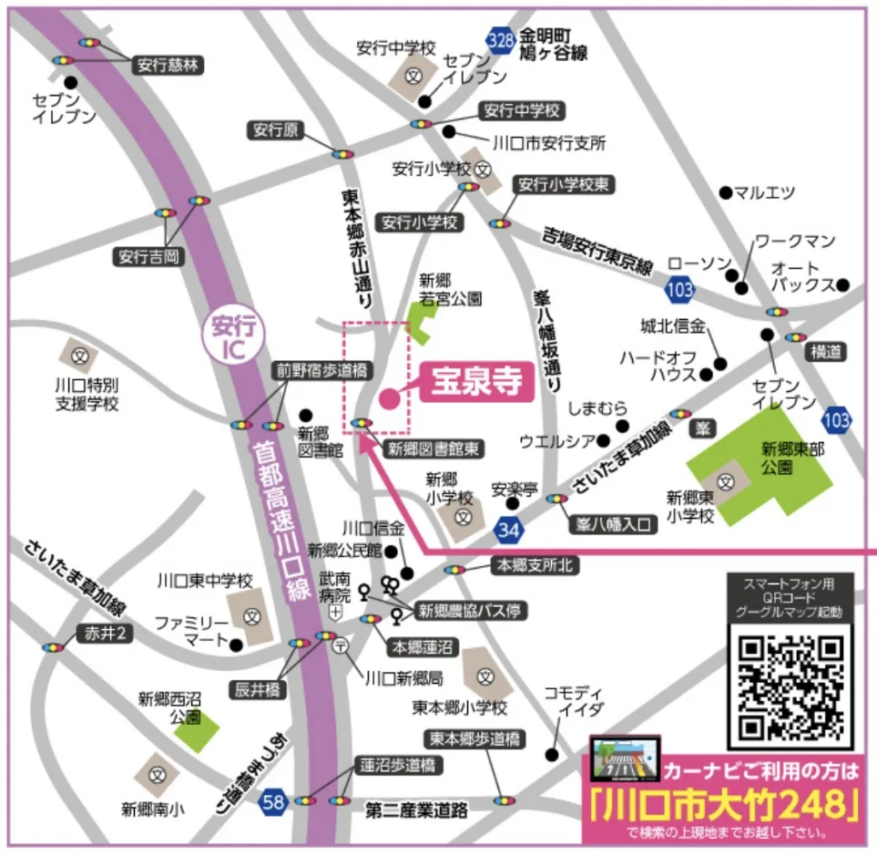 - 東武伊勢崎線「草加駅」西口より国際興業バス(新郷支所経由 川口駅行)に乗車。「新郷農協前」より徒歩13分